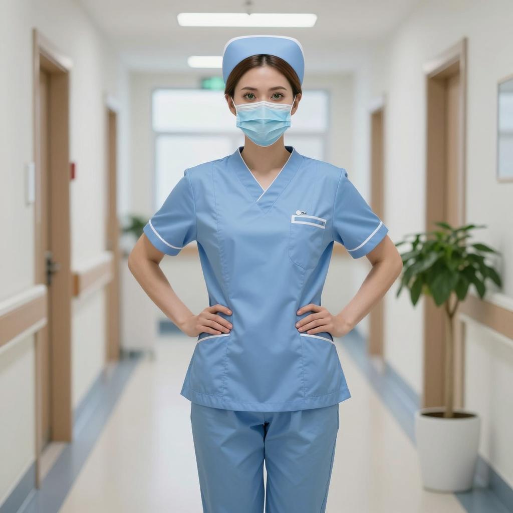 Makima nurse costume, photograph of female nurse, standing in hospital hallway, daytime, full body shot, wearing blue scrubs with white trim, blue cap, blue surgical mask, hands on hips, brown hair pulled back, green eyes, medium build, light skin, potted plant to the right, blurred windows and doors in background, bright natural light, clean and sterile environment, medical professional, professional photo, realistic style, symmetrical composition, focus on nurse, shallow depth of field