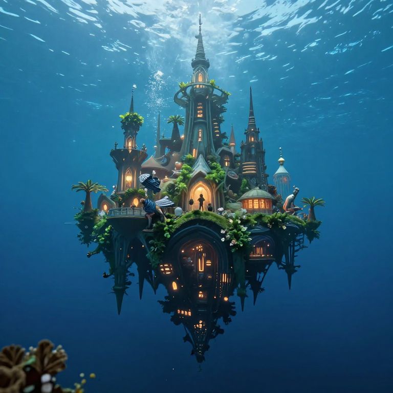 Suspended beneath the ocean's veil, a fantastical city of glowing spires and verdant arches cradles its inhabitants in a dreamlike realm of serenity and wonder, where the weightless air whispers of freedom and the eternal dance of life and water intertwines.