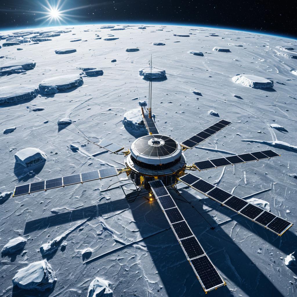 A visionary concept of a renewable energy hub located on a rocky extraterrestrial landscape, featuring advanced plasma reactors and tall energy towers. The hub beams energy to Earth via quantum frequency lasers beneath a vast space sky filled with vibrant gas giant planets, glowing cosmic clouds, and multiple moons. The scene illustrates futuristic engineering and sustainability technology for the future of humanity.