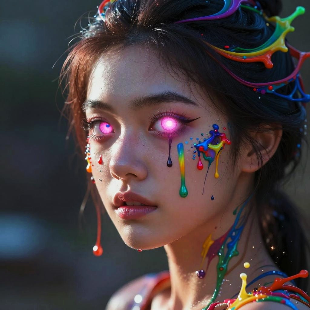 (Masterpiece:1.2), best quality, (illustration:1.2), (ultra-detailed), Eye focus, (Masterfully crafted Glow, pink lens flare), (Cinematic background), hyper details, (delicate details:2), (delicate detailed), (intricate details), in the air, octane render, hdr, (hyperdetailed:1.15), (soft light:1.2), 1girl, beautiful girl, ultra detailed eyes, mature, plump, thick, rainbow painting drops, paint teardrops, woman made up from paint, entirely paint, splat, splash, outdoors, (bioluminescent hair:1.1), (glowing eyes), ((makeup)), (Cinematic masterpiece), fierce, powerful, splashes of colour, absolutely eye-catching, (Cinematic headlighting), (whimsical:1.5), (Dynamic:1.4), light coming from above, growing shadows, ((caustic)), dynamic angle, beautiful detailed glow, ambient occlusion, ambient light, raytraced reflections, (best illumination, an extremely delicate and beautiful), ((cinematic lighting)), (soft:2), (Nephilim:1.2), (halo), demon horns, (1 angel wing), 1 demon wing, wings on back, half demon, demon ears, black wings, raven wings, (falling raven feathers:1.3), black hair, grey eyes, (red hair glow:1.2), (radiant aura), (lens flare:1.5), (warm lighting:1.4), (foreground elements:1.5), (perfect face:1.3), extreme detailed eyes, colorful, highest detailed, vibrant colors, high contrast, (8K UHD:1.2), (photorealistic:1.2), official art, unity 8k wallpaper, ultra detailed, beautiful and aesthetic, (zentangle, mandala, tangle, entangle), (fractal art:1.3), (cowboy shot), (Magic circle:1.2), (Magic:1.4), (((colourful))), (romantic:2), the most beautiful form of chaos, elegant, vivid colours, (romanticism:2), by james jean, roby dwi antono, ross tran, francis bacon, michal mraz, adrian ghenie, petra cortright, gerhard richter, takato yamamoto, ashley wood, atmospheric, ecstasy of musical notes, streaming musical notes visible