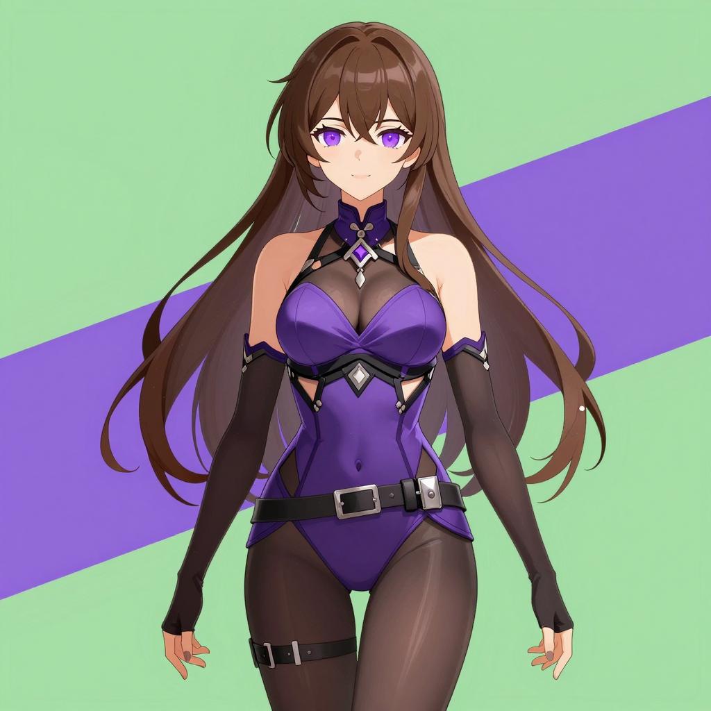 Digitally illustrated anime-style female character with very long brown hair and purple eyes. She is wearing a purple and black sheer bodysuit showing prominent cleavage and navel, with fingerless gloves, a belt, and pantyhose. The background consists of abstract green and purple geometric shapes.