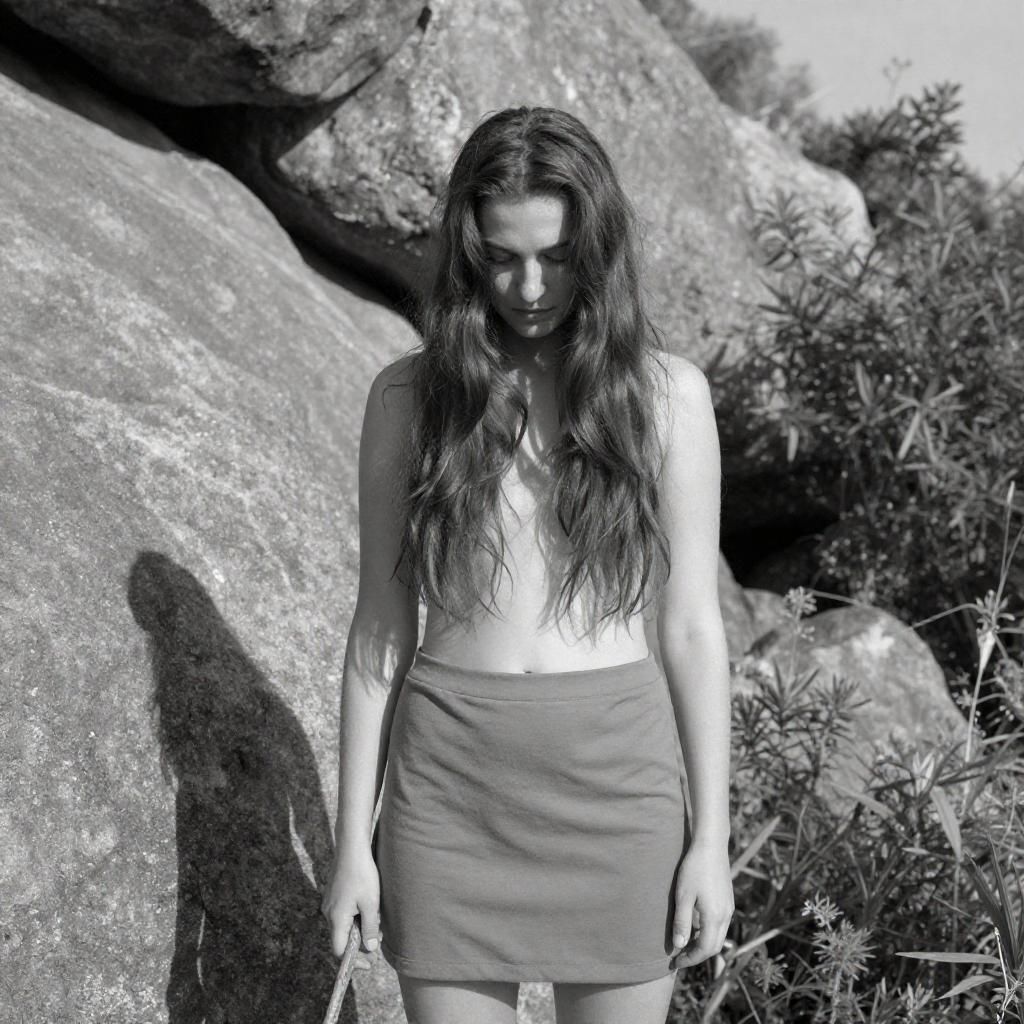 Photograph of a topless woman with long brown hair, standing in a rocky, sunlit area. She wears a gray skirt, holding a thin stick. Large rocks and green plants surround her. Black and white clothing on the right. She is looking down, with her hair partially covering her face.