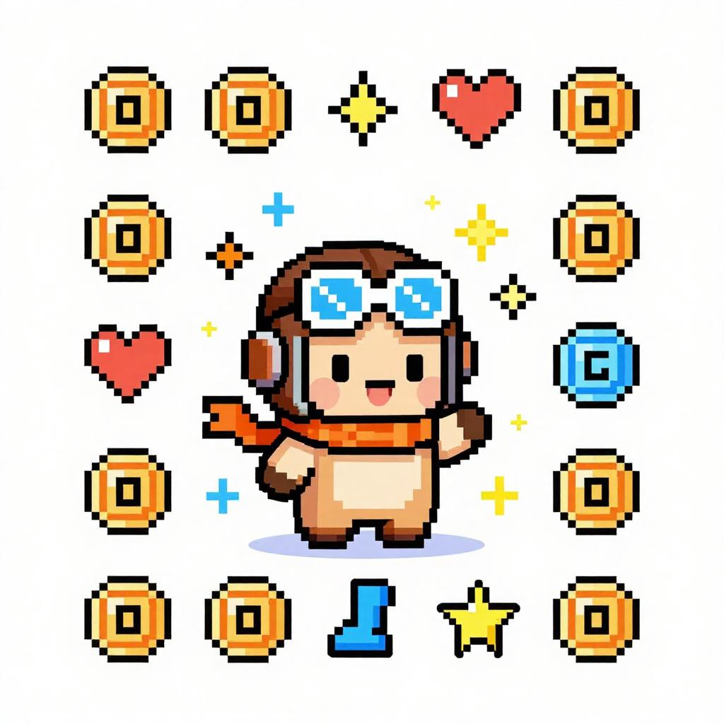 Pixel sprite-sheet of a blocky mech pilot with dashboard controls and helmet cam in a neon arcade with CRT scanlines, energetic expression, retro gaming vibe with HUD icons (coins, hearts, score), ring ropes or tokens as props, pixel confetti and impact stars, saturated high-contrast palette, crisp outlines, soft bloom and rim light, playful motion lines, clean app-icon-ready background, centered composition, nostalgic yet fresh.