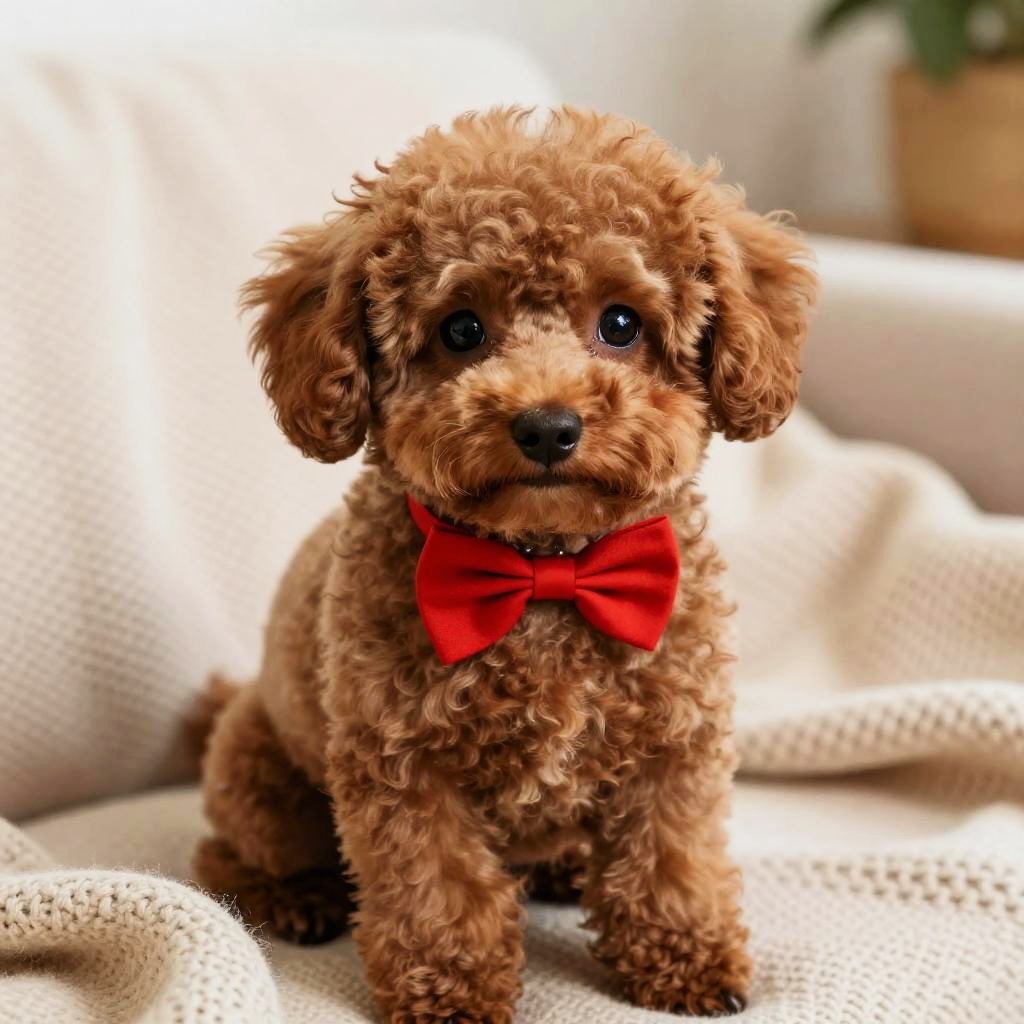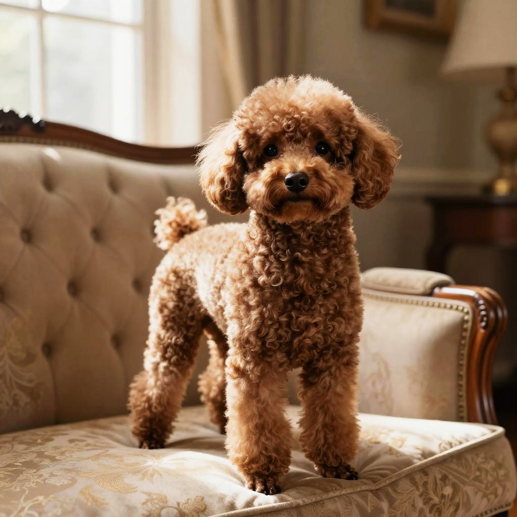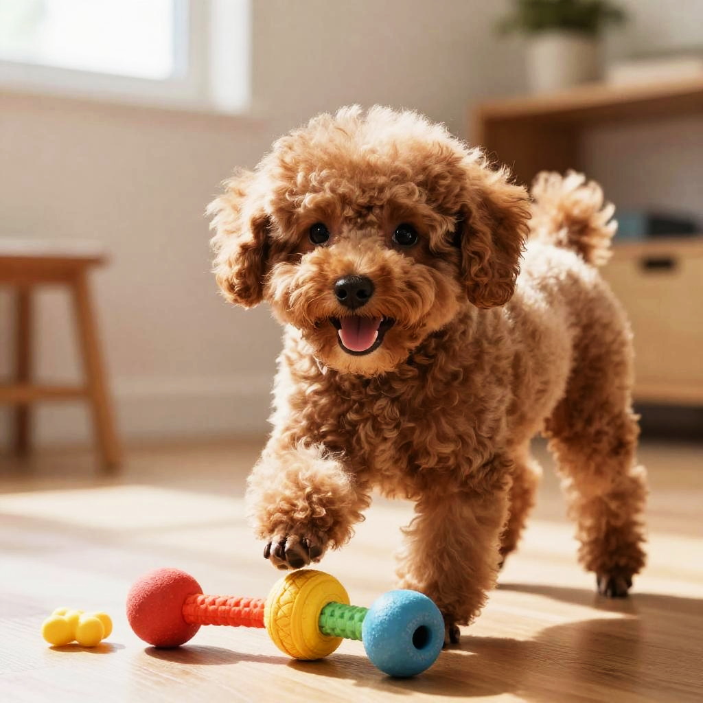 Cute brown poodle puppy playing with colorful toys on a wooden floor, bright cheerful room, morning sunlight, high detail fur texture, joyful and lively mood