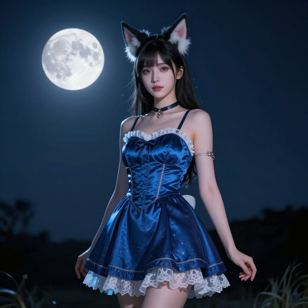 3dmm style, (masterpiece, best quality:1.4), midnight, cool, vivid, mesmerizing, 1girl, dress, dog ears, moon