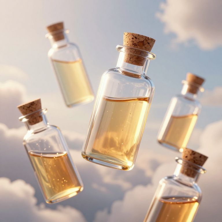 Photograph of five small, clear glass bottles with cork stoppers, each containing a golden liquid. The bottles are suspended in mid-air against a backdrop of a blue sky with fluffy white clouds. Sunlight filters through the glass, casting a warm, reflective glow on the liquid inside. The bottles are positioned at various angles, creating a dynamic and floating effect. The image has a soft, ethereal quality, enhancing the magical and mysterious atmosphere. The clear glass and cork stoppers are detailed, highlighting the simplicity and elegance of the bottles.