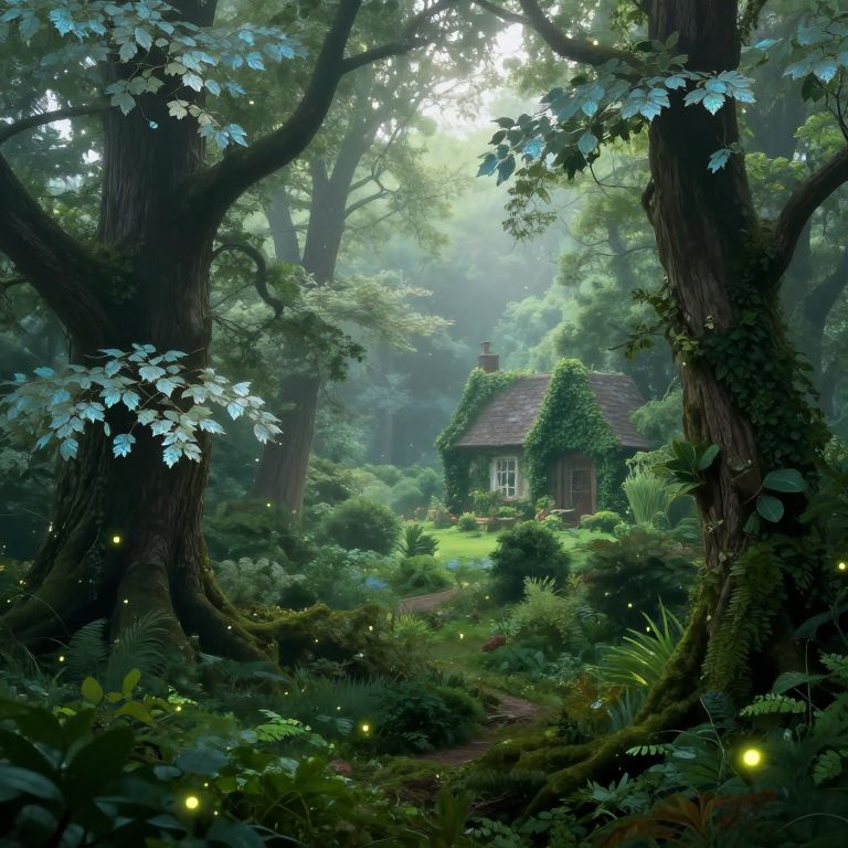 A mesmerizing digital landscape showcases an idyllic, misty morning in a verdant, enchanted forest viewed from an elevated perspective. Majestic ancient trees, adorned with delicate, translucent leaves that shimmer like opals under the soft dawn light, fill the foreground. The scene is imbued with an ethereal glow, as luminous fireflies dance among the verdant foliage. In the distance, a quaint, ivy-covered cottage emerges, seamlessly blending into its natural surroundings. This enchanting portrayal, reminiscent of the dreamlike worlds created by legendary artists like N.C. Wyeth, evokes both tranquility and wonder, inviting the viewer to immerse themselves in this captivating tapestry of nature and magic.