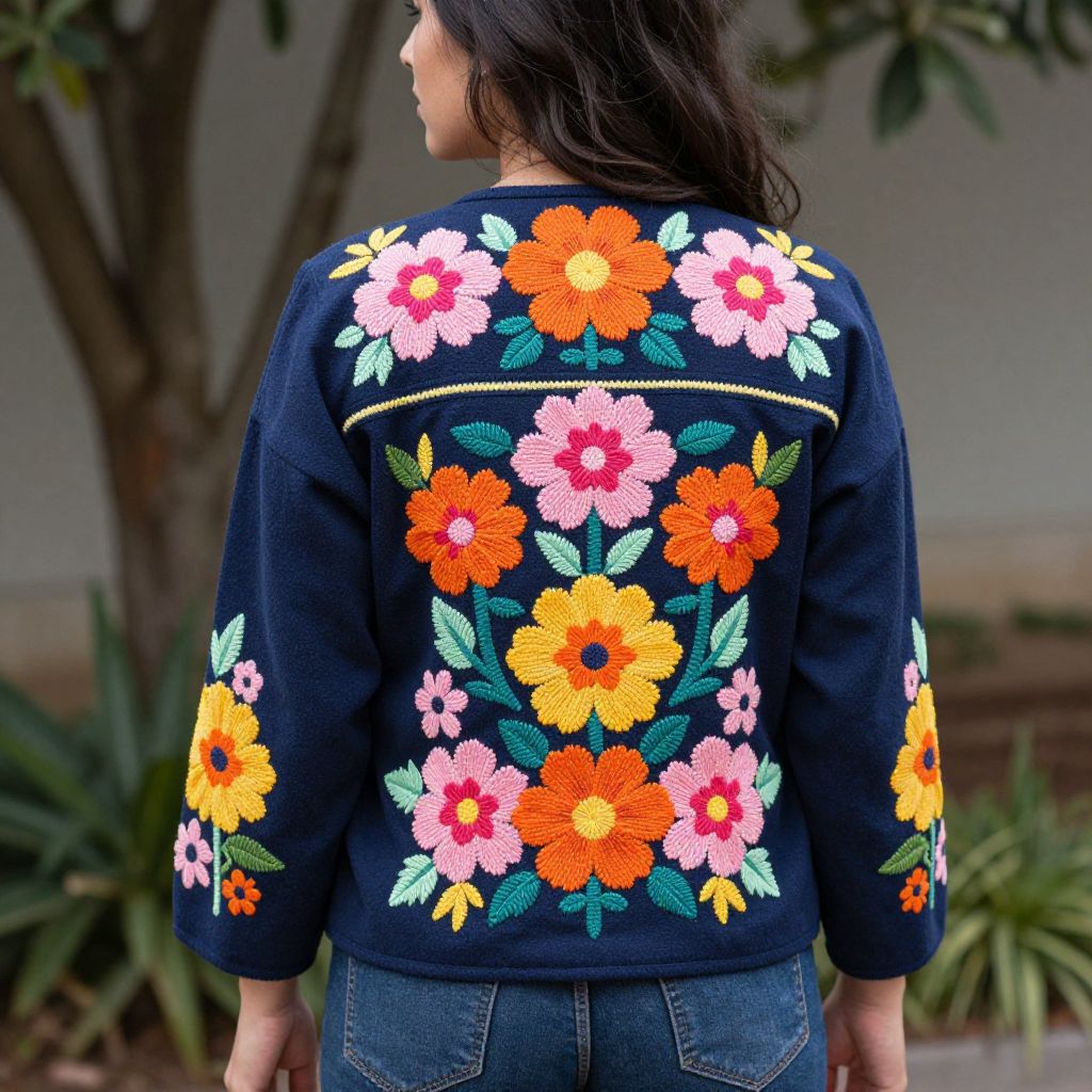 Photograph of a woman with long, dark hair, seen from the back. She wears a navy blue, long-sleeve sweater adorned with vibrant, embroidered floral patterns in orange, yellow, pink, and white, with green leaves. The flowers are arranged in a symmetrical, central design on the back, with smaller floral motifs on the sleeves. She also wears blue jeans. The background features blurred greenery and a beige wall, suggesting an outdoor setting. The texture of the sweater appears slightly rough, typical of denim-like fabric, while the embroidery is detailed and colorful.