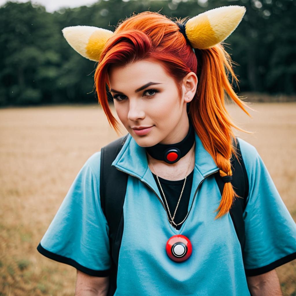Photo-realistic image of a young person cosplaying as Alder from Pokemon, featuring vibrant orange and red hair styled in a long ponytail with a black hair tie and yellow fuzzy ears. The individual wears a light blue poncho with black trim over a black shirt, a black choker collar with a red button, and a red and white Pokeball necklace. The background shows an outdoor field with greenery, captured with natural lighting and shallow depth of field for a soft blurred effect.
