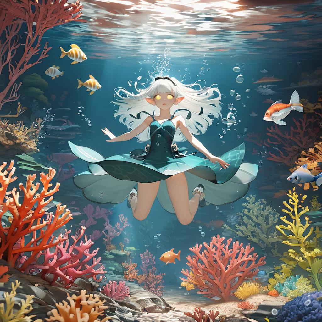 Digital anime-style illustration of a white-haired, elf-like girl with glowing yellow eyes, wearing a teal dress, underwater. She floats with arms outstretched, surrounded by colorful coral reefs in red, orange, yellow, and green. Three vibrant fish swim near her, and sunlight filters from above, casting a shimmering glow. Bubbles rise around her, enhancing the underwater effect. The background shows a dark blue ocean floor with more coral and rocks. Her dress billows outward, adding a sense of movement and grace to the serene underwater scene.