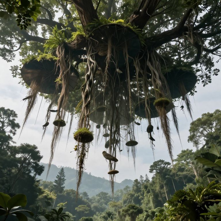 Forests grow upside-down from the sky, their roots dangling as ethereal umbrellas sheltering aloft creatures unseen.