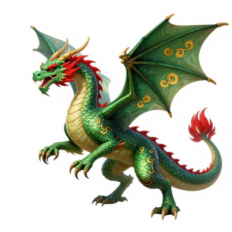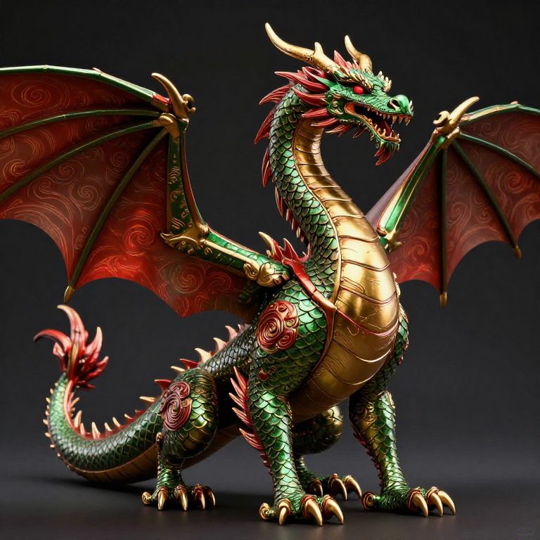 Metalness western style dragon with green red and gold scales in swirling patterns, outstretched wings, long neck and head held high,