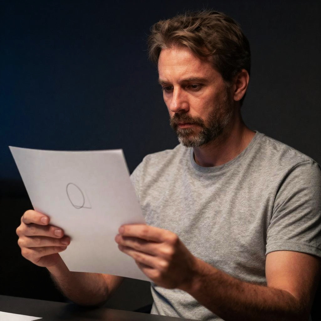 Photograph of a middle-aged man with light brown hair and a short beard, holding a white sheet of paper with a simple line drawing. He is in a dimly lit room, looking intently at the paper. He wears a gray t-shirt. His expression is focused. Background is dark with blue light. Man is positioned to the right, paper in his left hand.