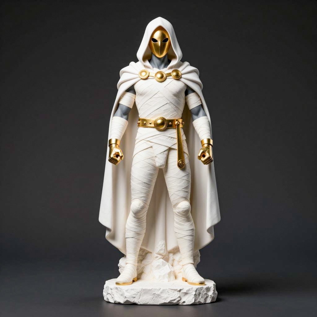 Statue of a male character with gray skin, wearing a hooded white cloak, bandaged body, and gold accents. He has a face mask, clenched fists, and gold claw-like gloves. Standing on a stone pedestal, black background.