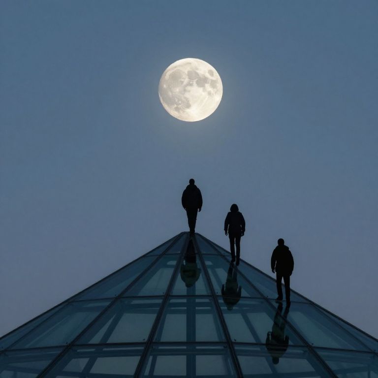 Photograph of three silhouetted figures walking up a glass pyramid at dusk, with a large, bright full moon in the clear blue sky above. The pyramid's glass panels reflect the moonlight, creating a contrast between the dark figures and the illuminated sky. The figures, dressed in dark clothing, are spaced evenly across the pyramid's peak, with one slightly ahead of the others. The overall composition emphasizes the stark, minimalist aesthetic and the interplay of light and shadow.