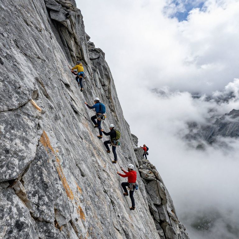 Photograph of a snow-covered, jagged mountain peak at sunrise. The sun is partially obscured by mist, casting a bright, golden light on the right side of the image. Four climbers, dressed in colorful jackets (pink, yellow, red, and green), are ascending the steep, rocky slope, with ropes in hand. The climbers' small figures contrast with the towering, craggy mountain, which has dark, rugged textures and sharp ridges. The sky above is a pale blue, blending into the mist. The overall scene conveys a sense of adventure and the challenge of mountain climbing.