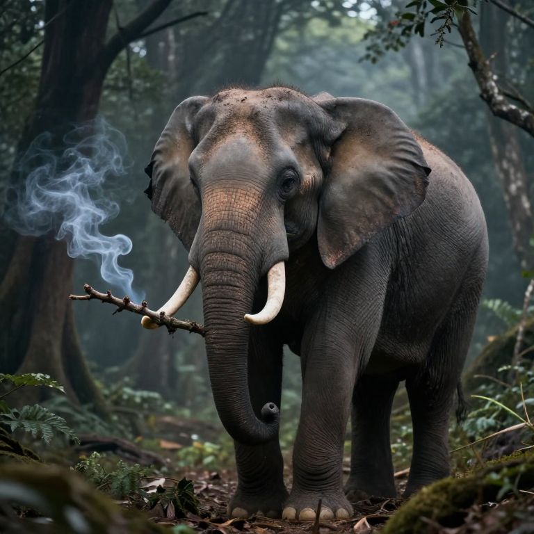 A highly detailed 3D-rendered elephant stands amidst a misty forest, its trunk delicately holding a bundle of twigs as if playing a forgotten instrument, evoking a surreal and ethereal atmosphere with its lifelike textures and dramatic lighting.