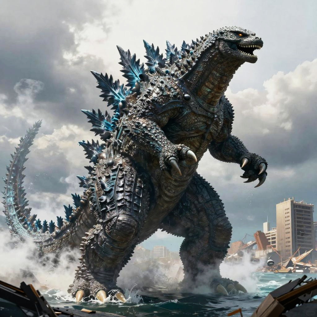Godzilla drawing realistic concept, gigantic reptile rising from deep sea with intricate scales, powerful muscular limbs, steam and mist surrounding, photorealistic textures and lighting showing wet skin and damaged buildings, intense and dynamic pose