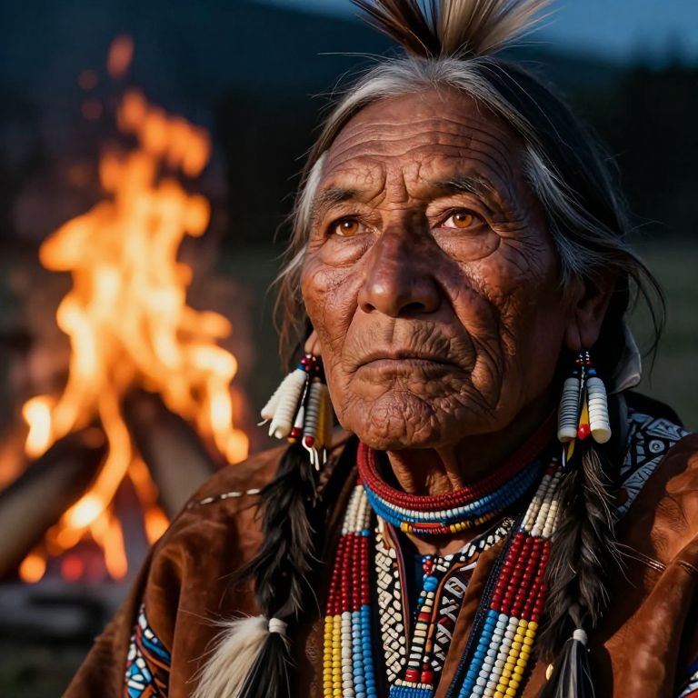 A captivating portrait photo reveals an enigmatic Native American elder with wise amber eyes and smooth, aged skin, bathed in the warm glow of a campfire from a unique worm's-eye perspective. This intimate close-up showcases intricate patterns on his handmade leather attire and finely beaded jewelry. The flickering firelight casts dramatic shadows across his face, inviting viewers to reflect on tradition and wonder at the rich tapestry of his life experiences as he contemplates generations past. Hyperrealistically captured, this portrait embodies a life steeped in history and wisdom.