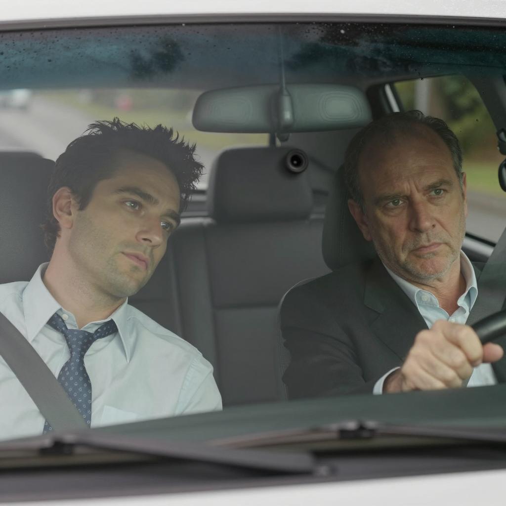 Four men in a car at night. Driver wears brown jacket, blue shirt. Passenger with short brown hair, leather jacket, looking down at phone. Another passenger with dark hair, orange shirt, smiling. Fourth man with bald head, dark jacket, looking ahead. Car interior, dim lighting, yellow lights above.
