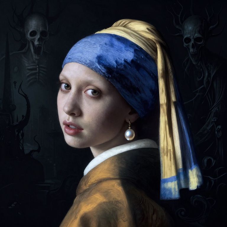 An eerie, high-definition masterpiece of a girl with a pearl earring, rendered in exquisite, 8k ultra-high definition with incredible anatomical detail, set against a haunting, Lovecraftian horror backdrop, reminiscent of the dark, gothic works of H, Giger and the surreal, fantastical art of Zdzisław Beksiński, with a focus on capturing the finest textures and subtle, otherworldly lighting effects, as if illuminated by the soft glow of an eerie