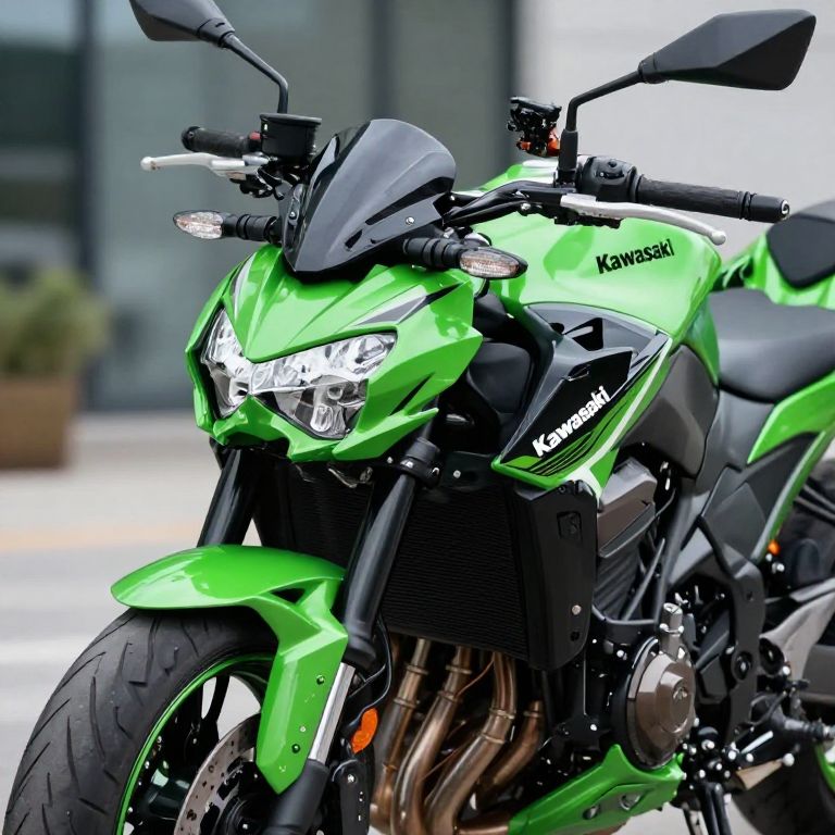 Stylish Kawasaki Z800 motorcycle showcased in vibrant green and black livery, featuring a sleek fairing, dual front headlights, and a prominent \"Kawasaki\" logo, captured in sharp detail against a blurred outdoor backdrop.