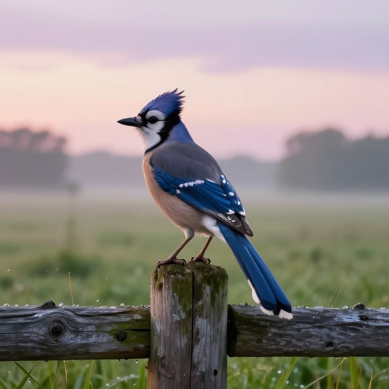 A blujay sitting on an ancient wooden fence post in a rural meadow at dawn, dew drops on grass, soft pastel colored sky in the background, detailed feathers shimmering with iridescence, peaceful rural life vibes with artistic brushstroke effect.