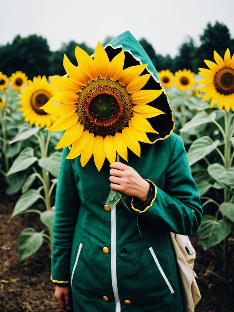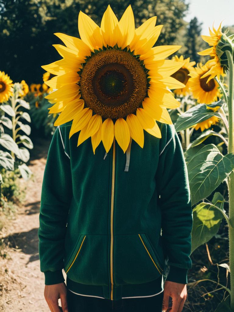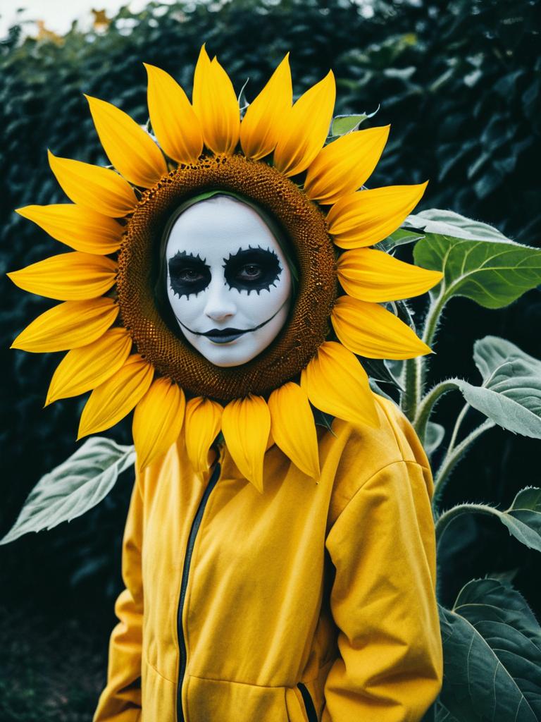 Person with Sunflower Costume, cinematic realism, whimsical cosplay portrait