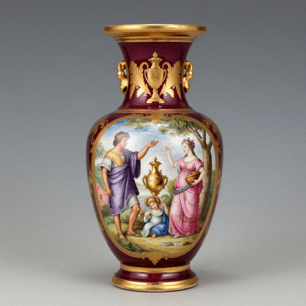 Elegant porcelain vase with gold accents, depicting classical scene of three women and a child around a urn, against a gradient gray background.