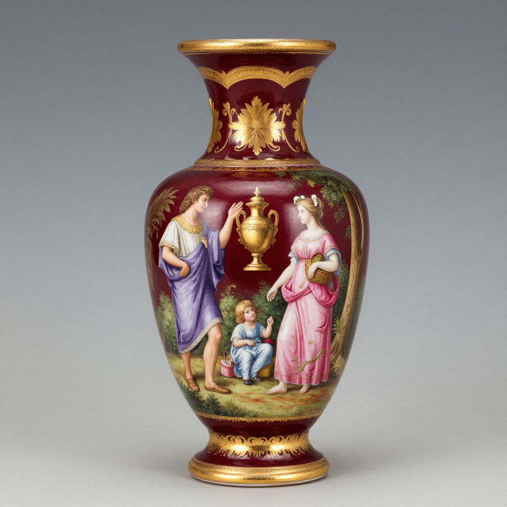 Photograph of an ornate ceramic vase with a rich burgundy base and gold accents. The vase features an intricate painting of three figures: a woman in a purple dress with golden trim, a child in blue, and another woman in a pink dress with golden accents, standing around a golden urn. The background includes greenery and a grassy area. The vase has a flared neck with a sunburst pattern in gold and a wide, round base. The background of the image is a gradient from light gray to dark gray.