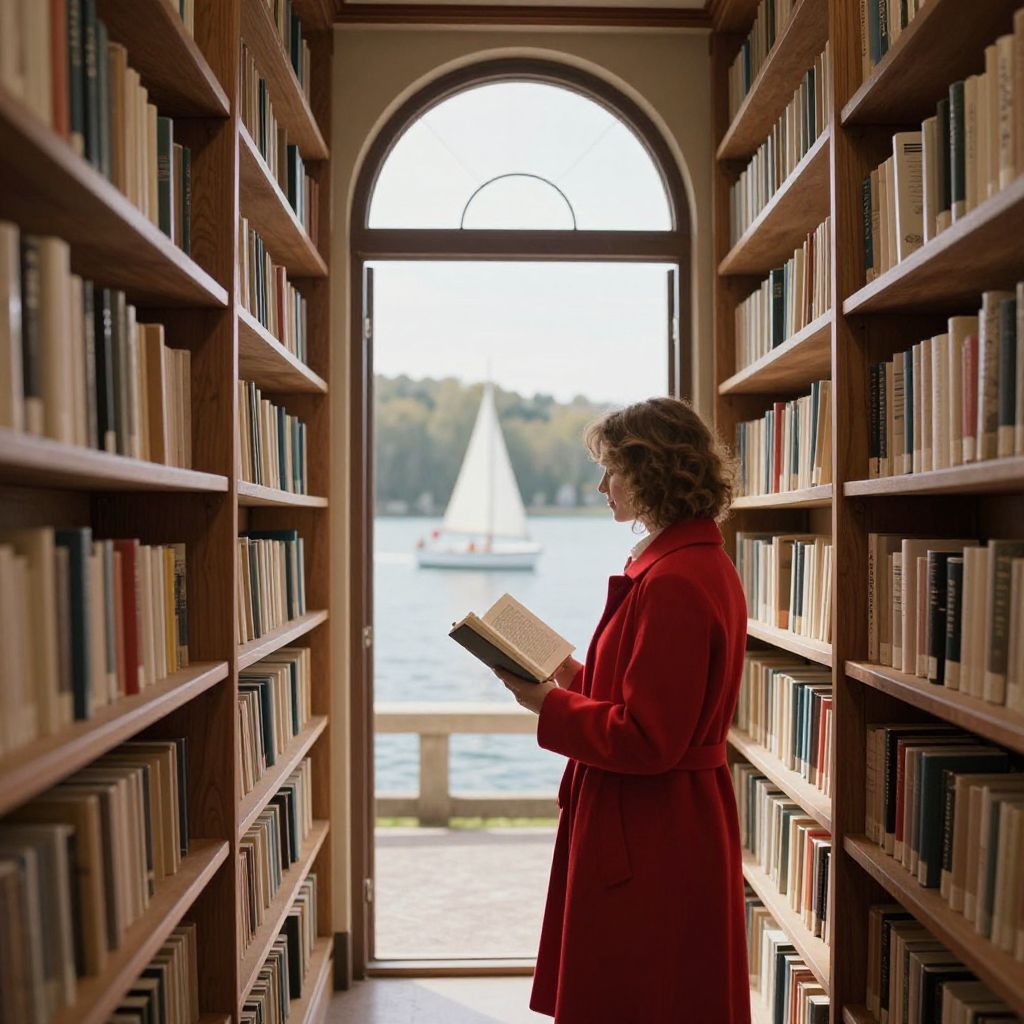 A woman wearing a vibrant red coat stands between tall wooden bookshelves in a library. She holds an open book and looks out through an arched doorway that opens to a peaceful lakeside view, featuring a sailboat on calm water and a sunlit natural landscape.