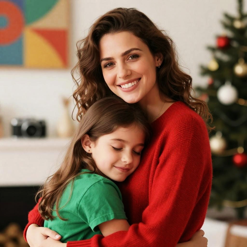 Photograph of two women hugging. Blonde woman with green Christmas sweater, red plaid headband, smiling. Black-haired woman with green Christmas sweater, back to camera. Background with blurred red poinsettias and shelves. Warm, festive atmosphere.