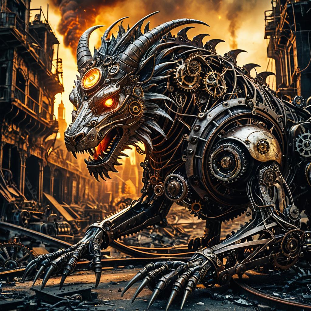 Steampunk Chimera with Fiery Glow in Abandoned City