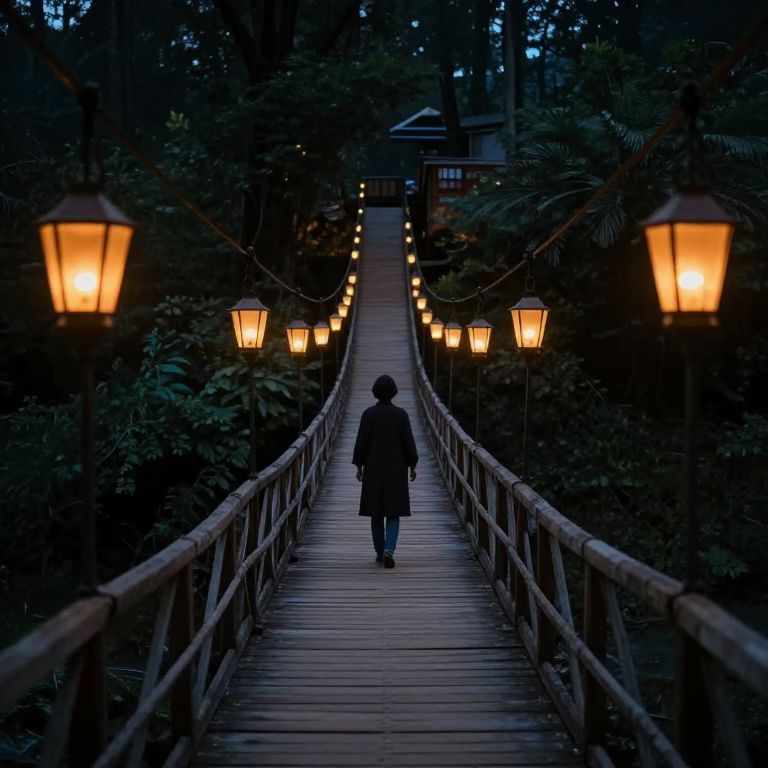 Suspended between realms of knowledge and mystery, a wooden bridge whispers forgotten tales beneath the glow of flickering lanterns, inviting solitary wanderers to traverse the chasm of infinite stories and introspection.