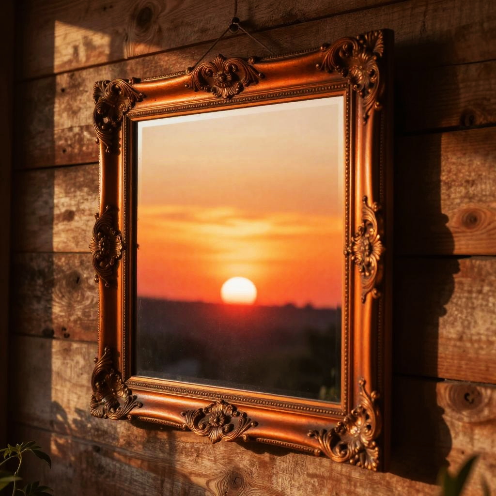 Orange tinted mirror hanging on a rustic wooden wall in a sunlit room, reflecting vibrant orange and red sunset hues, intricate ornate frame, delicate shadows and highlights, hyper-realistic style with a touch of surrealism, warm and inviting ambiance.