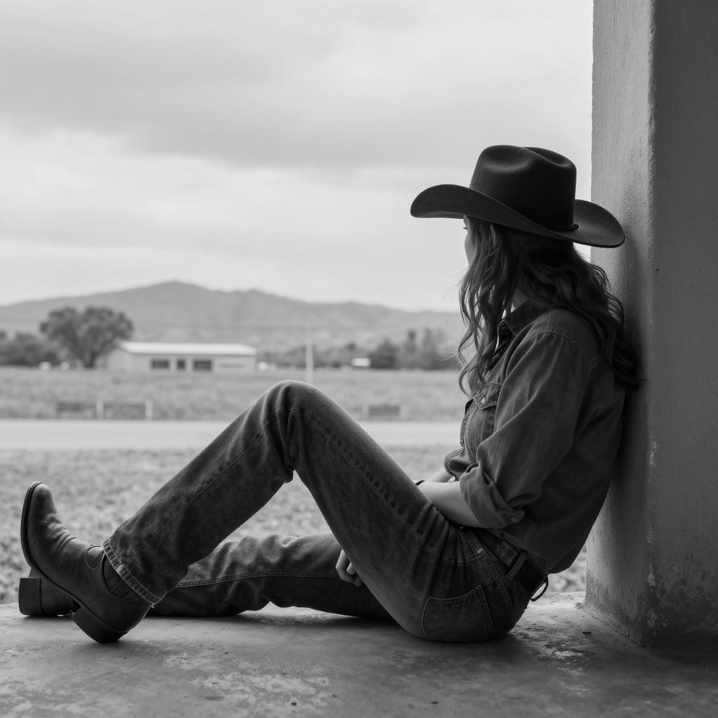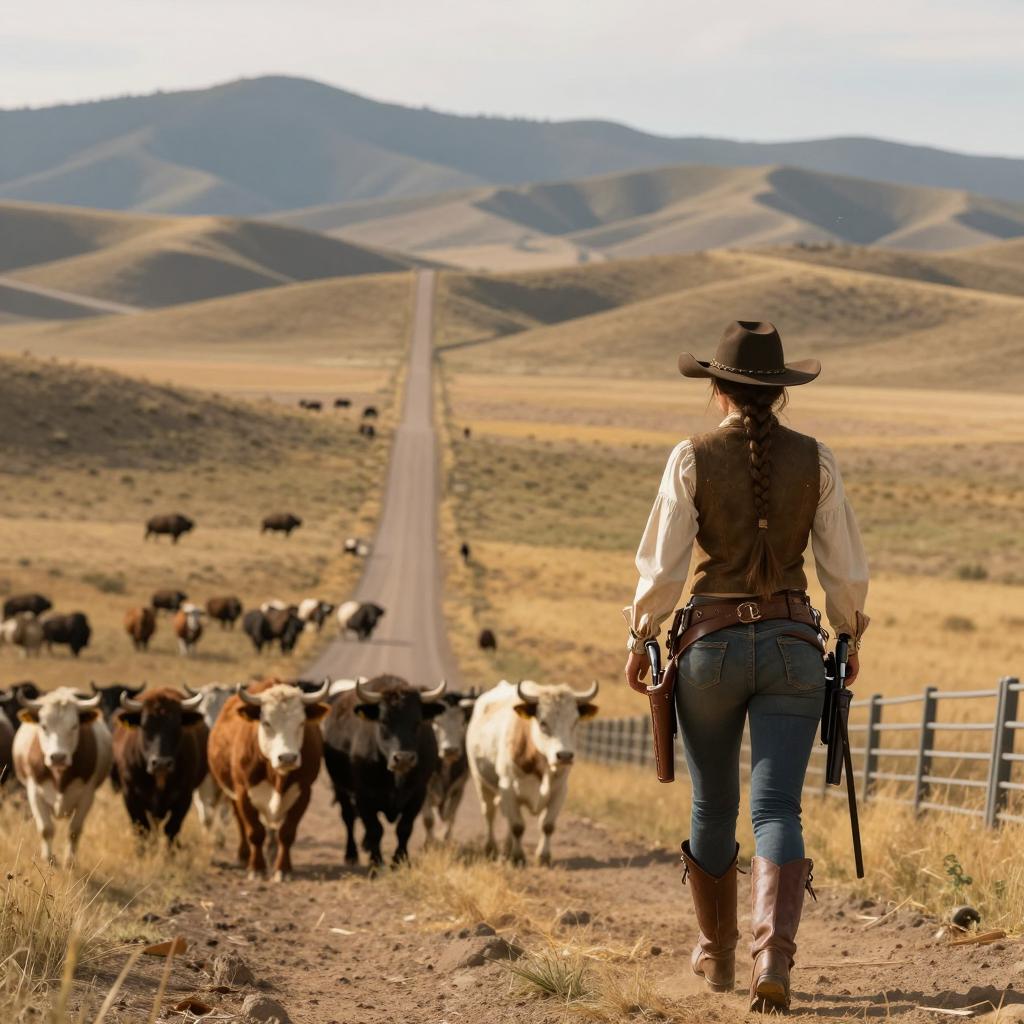 A female cowboy with long braided hair, wearing a brown cowboy hat, white shirt, brown vest, blue jeans, and brown boots, guides a herd of cattle along a dirt path in a golden prairie. She holds a rifle and has dual holsters at her hips. The scene features rolling hills, distant mountains, grazing bison, and a long straight road flanked by fences, captured in cinematic western lighting with atmospheric depth and details.
