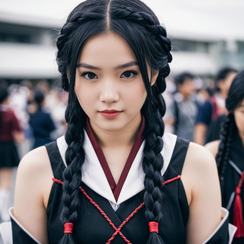 Luffy strong world costume,1girl, solo, hat, black hair, skirt, straw hat, realistic, twin braids