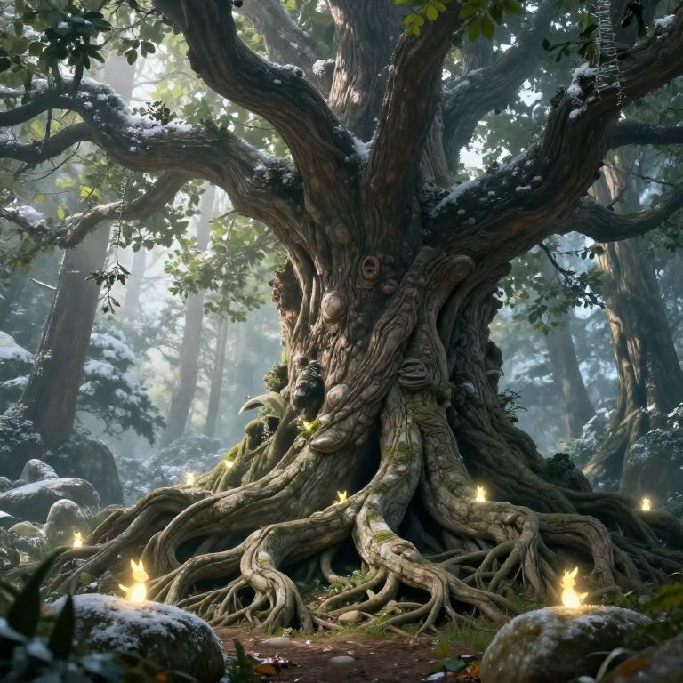 A stable symbol formed by intertwined tree roots and vines in an enchanted forest, soft glowing particles around, serene atmosphere, fantasy realism, vibrant greens and earth tones