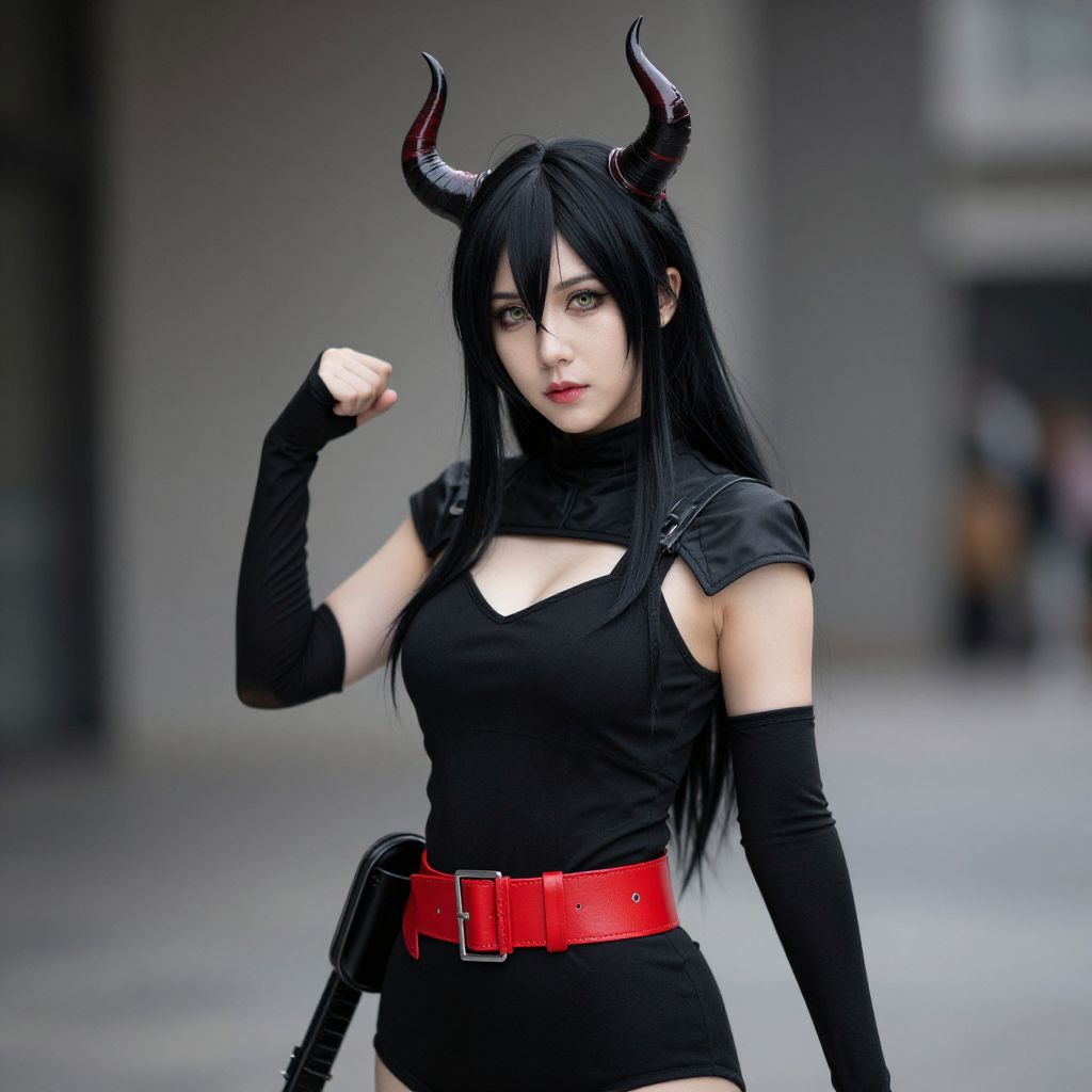Photograph of an Asian woman cosplaying as a demonic character. She has long black hair, pale skin, and wears black, sleeveless, form-fitting attire with a high collar and red belt. Her outfit includes black elbow gloves and small black shoulder pads. She sports dark, curved, horn-like headpieces and has a determined expression with her right fist raised. The background is an urban, gray-toned setting with blurred, indistinct elements. Her makeup is minimal, emphasizing her natural features. The image has a sharp, realistic style with a slight blur effect in the background.