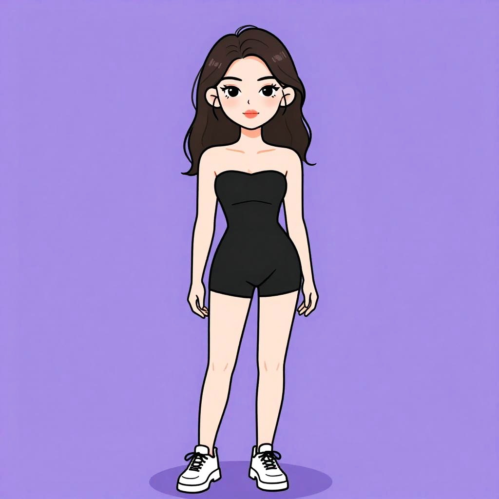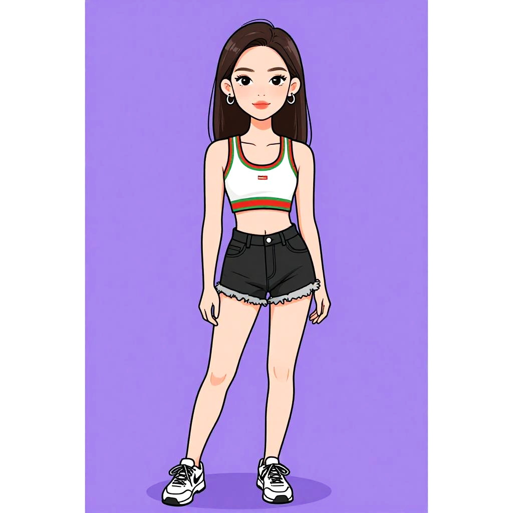 Illustration of a young woman with long brown hair wearing a black baseball cap, navy blue athletic crop top with single shoulder strap, and matching high-waisted shorts. She is also wearing black sneakers with white soles, standing against a plain purple studio background.