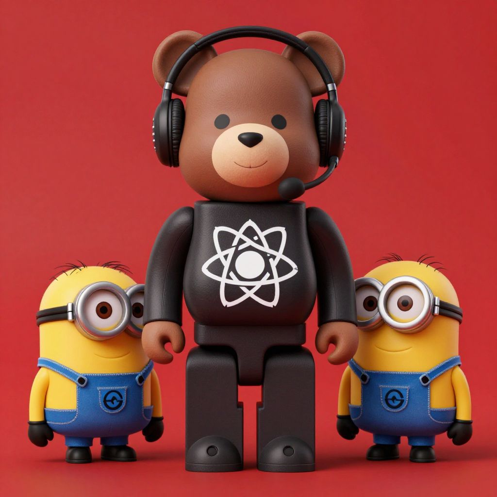 Photograph of a brown bear LEGO figure wearing headphones and a black shirt with a white atom symbol, flanked by two yellow Minion LEGO figures,