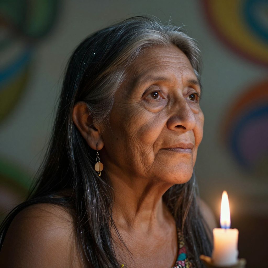 Photograph of an elderly Native American woman with long, straight, gray-black hair, wearing a colorful beaded necklace and small, gold hoop earrings. Her deeply wrinkled face, with dark brown eyes and a solemn expression, is illuminated by a warm, glowing candle in the background. The background is blurred, featuring circular, colorful patterns. The candlelight highlights her weathered skin and thoughtful gaze. She is positioned slightly to the right, with the candle to her left, creating a soft, intimate atmosphere. The image captures her wisdom and dignity.