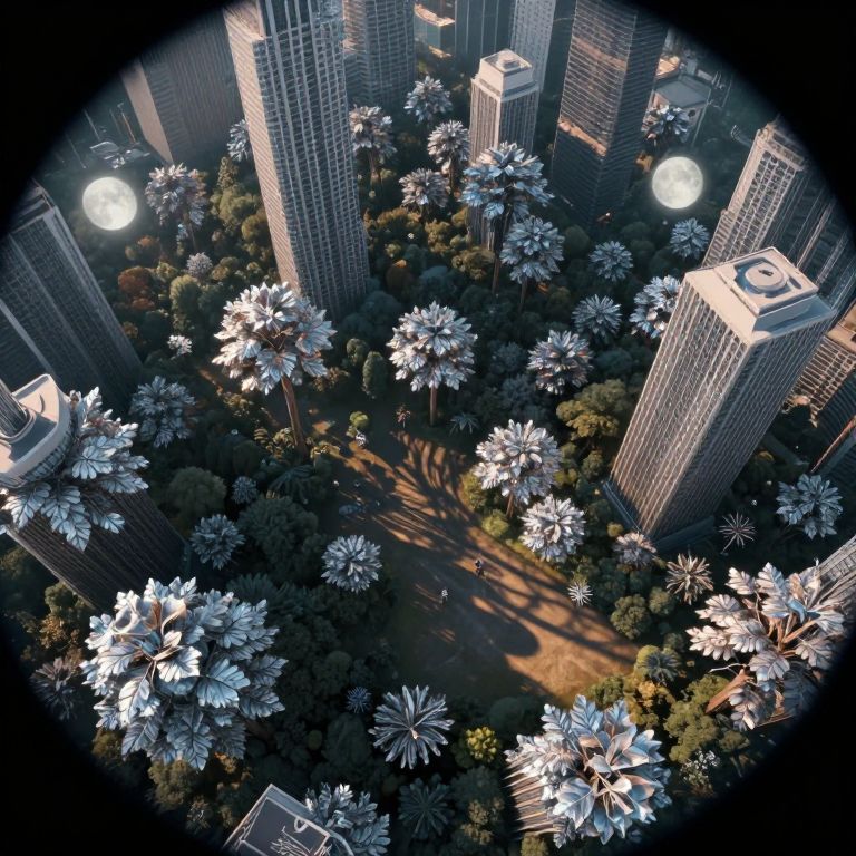 Imagine a captivating digital art scene inspired by surreal landscapes, featuring a forest where traditional trees are replaced with towering skyscrapers, their metallic leaves shimmering like chrome. From an aerial perspective reminiscent of seeing through a bug's eye lens, the composition captures both awe and confusion in its ethereal beauty. The forest glows under the soft light of two moons, casting long, distorted shadows that dance playfully across the ground, blending reality with fantasy. This mesmerizing image evokes an emotional gradient ranging from wonder to perplexion, inviting viewers into a world where nature and technology collide in a harmonious yet unsettling embrace.