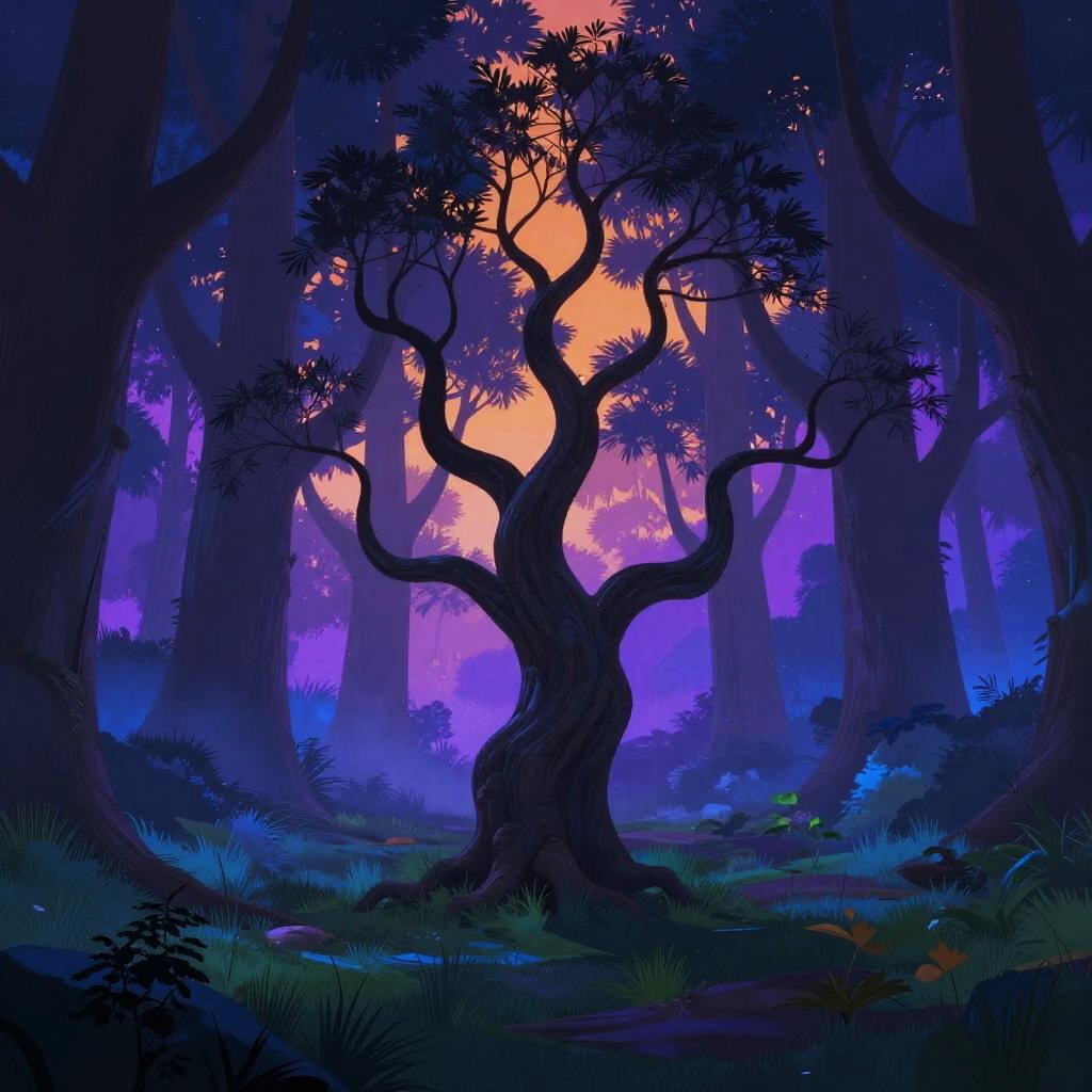 This is a vibrant, digitally created fantasy forest scene. A central, dark tree with twisted branches stands in the foreground, surrounded by taller, shadowy trees. The background is awash with vivid purples, blues, and oranges, creating a magical, ethereal glow. The ground is covered in lush, green grass, and a misty, blue light filters through the trees, adding to the mystical atmosphere.