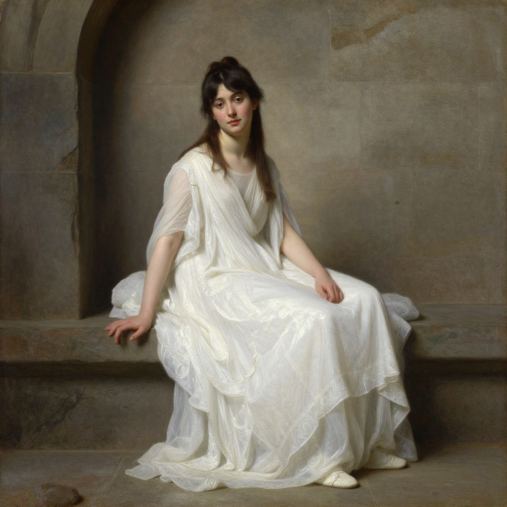 A classical oil painting by William-Adolphe Bouguereau depicts a serene young woman in a flowing white gown, seated gracefully against a rustic stone wall, illuminated by soft natural light that enhances the delicate textures and subtle shading of her attire and surroundings.