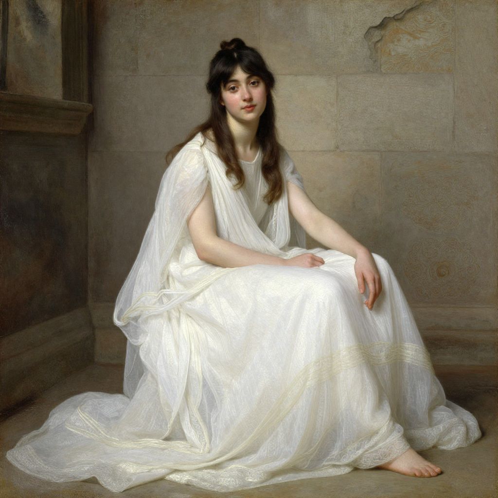 Digital painting of a young woman with pale skin and dark brown hair, wearing a flowing white Grecian-style dress, seated on a stone floor in
