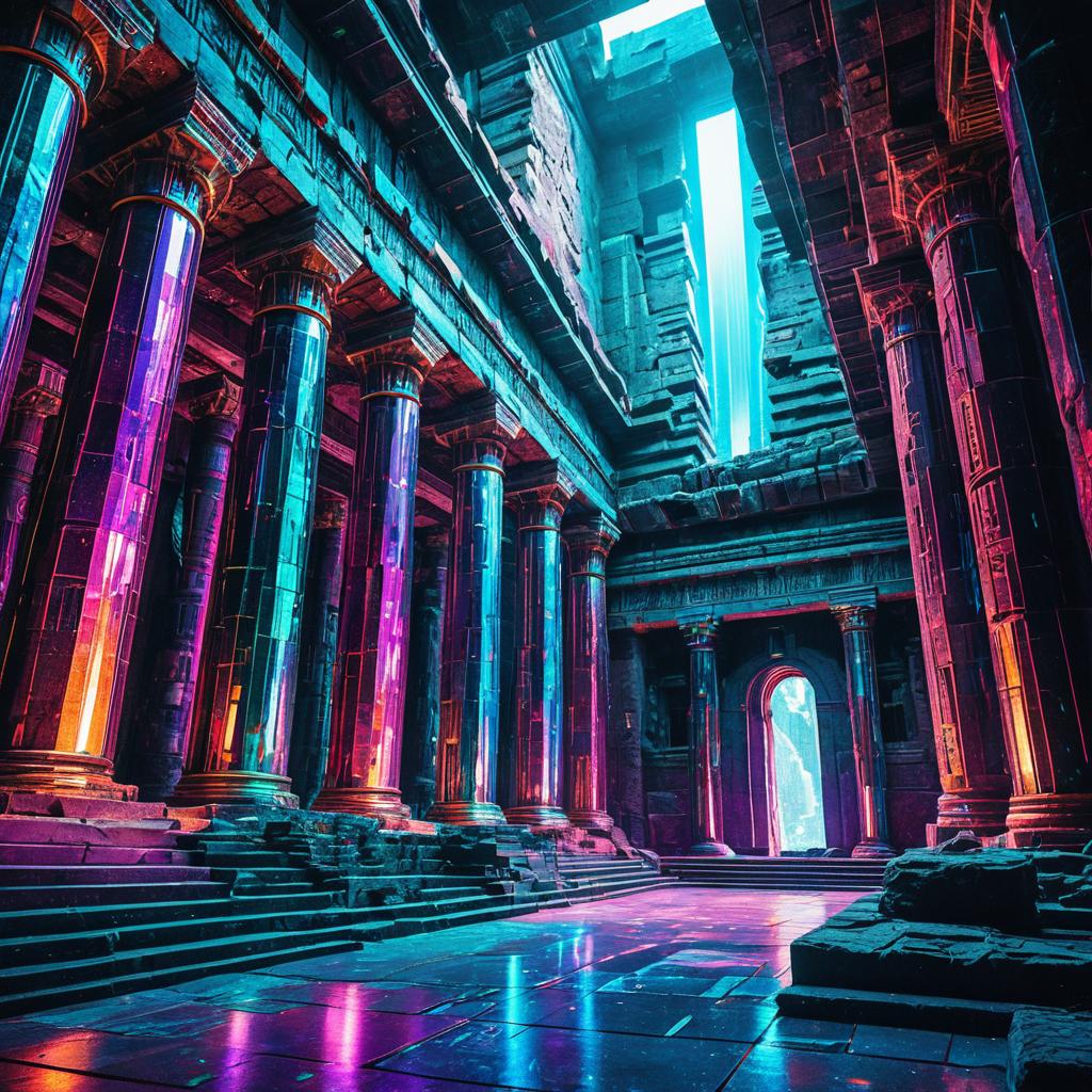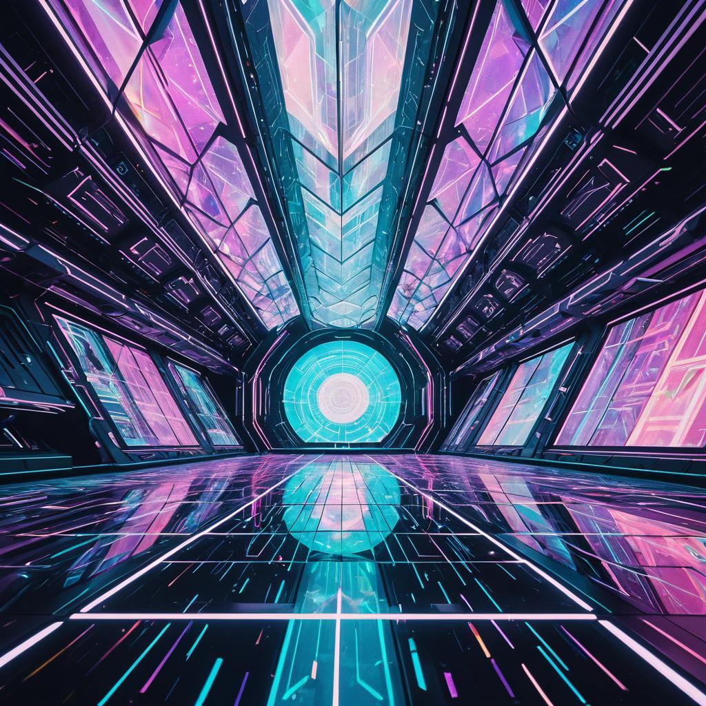 A highly detailed futuristic bridge interior featuring iridescent metallic colors in holographic art style. The corridor is illuminated with vivid blue and purple neon lights, reflecting off glossy geometric surfaces and intricate architectural elements. The environment evokes a surreal and high-tech atmosphere with atmospheric lighting and ultramodern design.