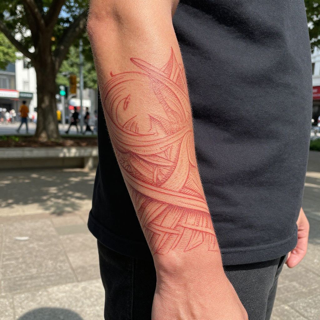 Forearm red tattoo men in natural light, showcasing a strong male figure with intricate red ink tattoo wrapping around the forearm, fine lines and shading, casual streetwear, standing in a sunlit urban park, photorealistic, intense colors emphasizing the tattoo.