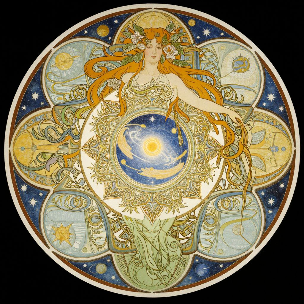 The image is a stunning illustration in the Mucha style, featuring a woman with long, flowing hair adorned with flowers and leaves. She is encircled by intricate, symmetrical patterns that resemble a mandala, with a central motif of a celestial sphere surrounded by stars and planets. The background is a deep, starry night sky, adding a sense of depth and infinity. The colors are rich and vibrant, with shades of gold, blue, and green dominating the palette, creating a sense of harmony and balance. The overall composition is circular, with the woman and the surrounding patterns creating a loop of infinity, symbolizing eternal life and the cyclical nature of existence. The interplay of light and shadow enhances the depth and texture of the image, making it visually captivating and emotionally evocative.