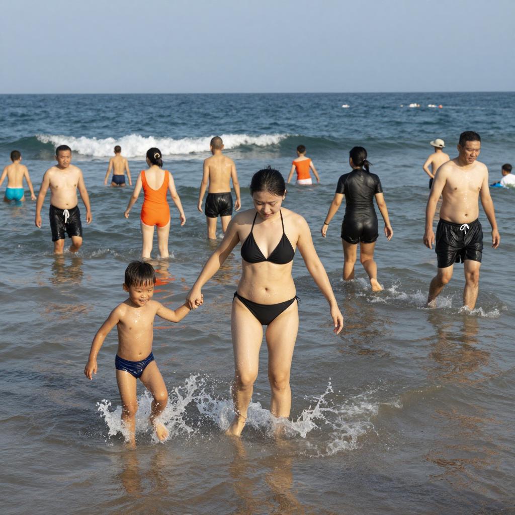 Group of 11 people surfing in the ocean. They are in line, wearing swimwear, mostly in blue and red. Surfboards are visible below water level. Waves are crashing around them. Bright daylight. Clear sky in background. People are smiling, arms outstretched. Water splashing around their feet.
